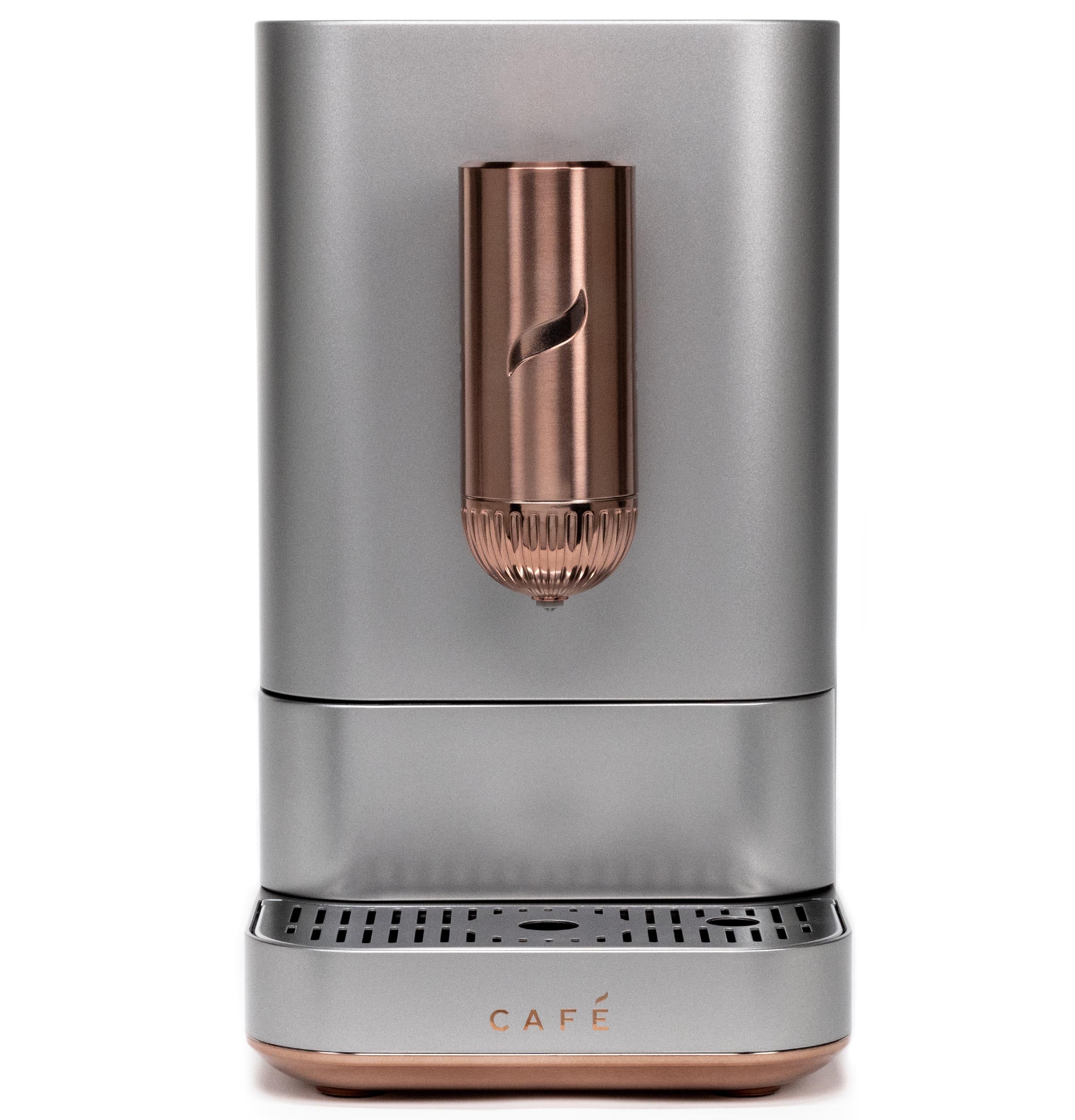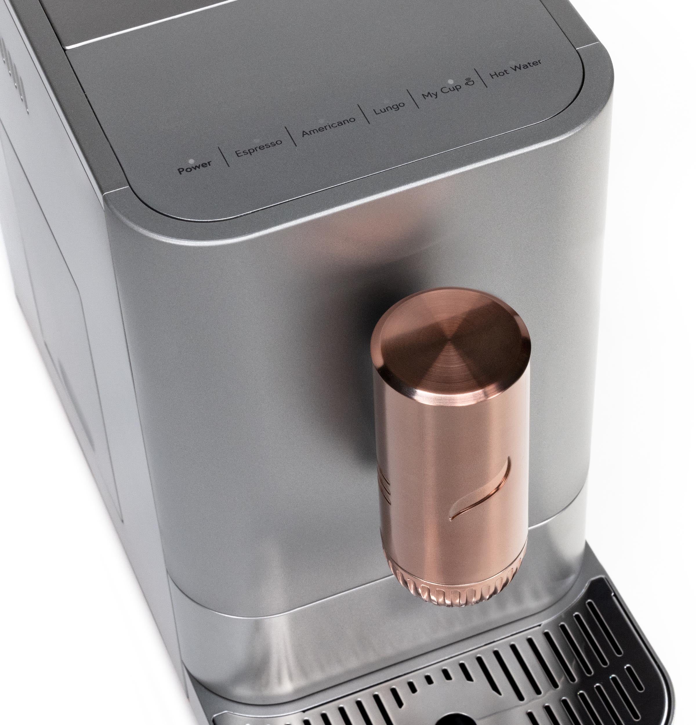 This compact espresso machine has a 7" wide footprint and is adorned with signature copper accents, adding style and sophistication to any countertop