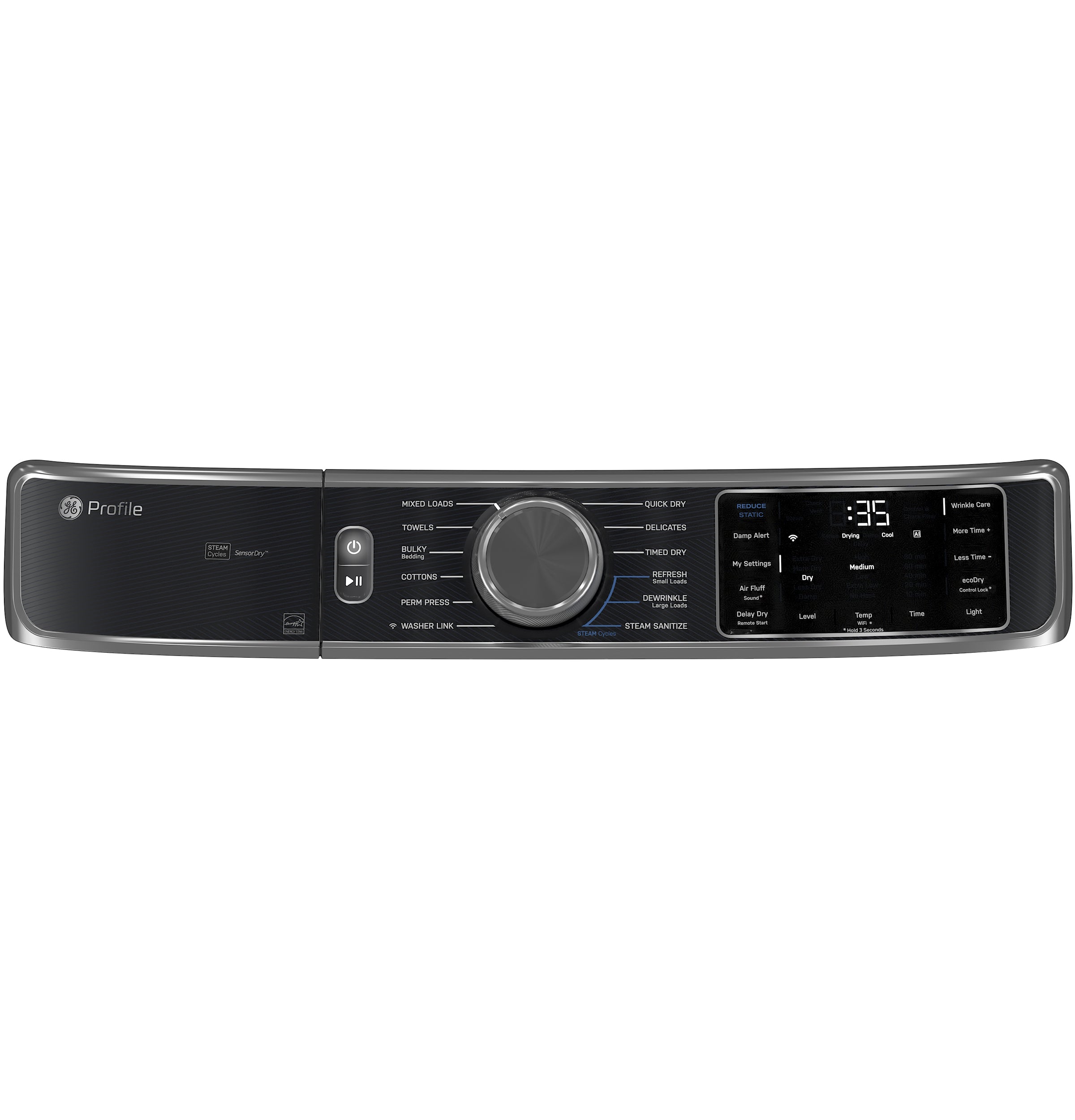 | Dryer Cycles | Bulky / Bedding, Cottons, Delicates, Mixed Loads, Perm Press, Quick Dry, Steam Dewrinkle, Steam Refresh, Steam Sanitize, Timed Dry, Towels, Washer Link |