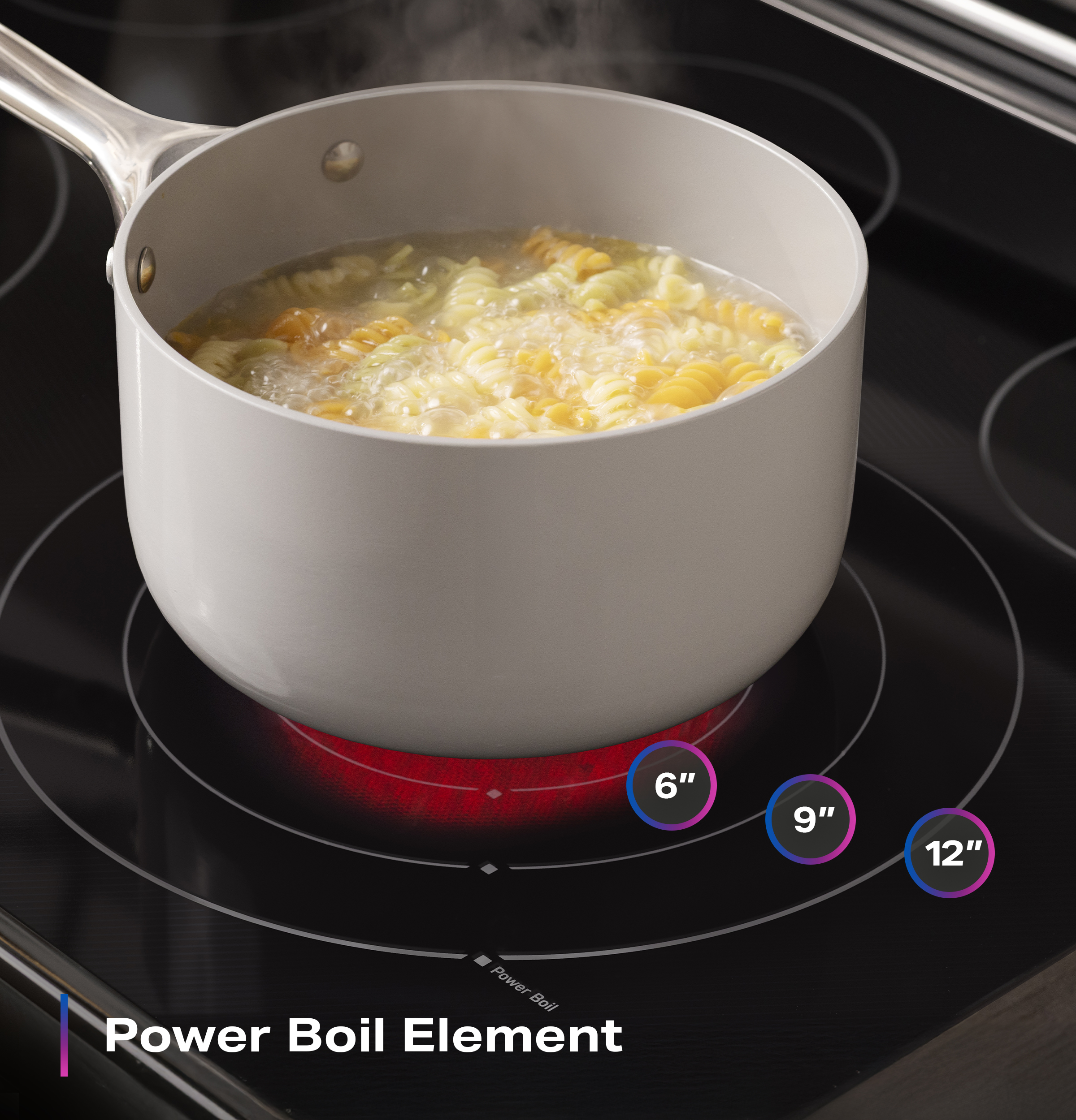 Easily adjust to any size pot or pan with a convertible 12"/9aEUR/6aEUR element that makes it easy to boil water faster.