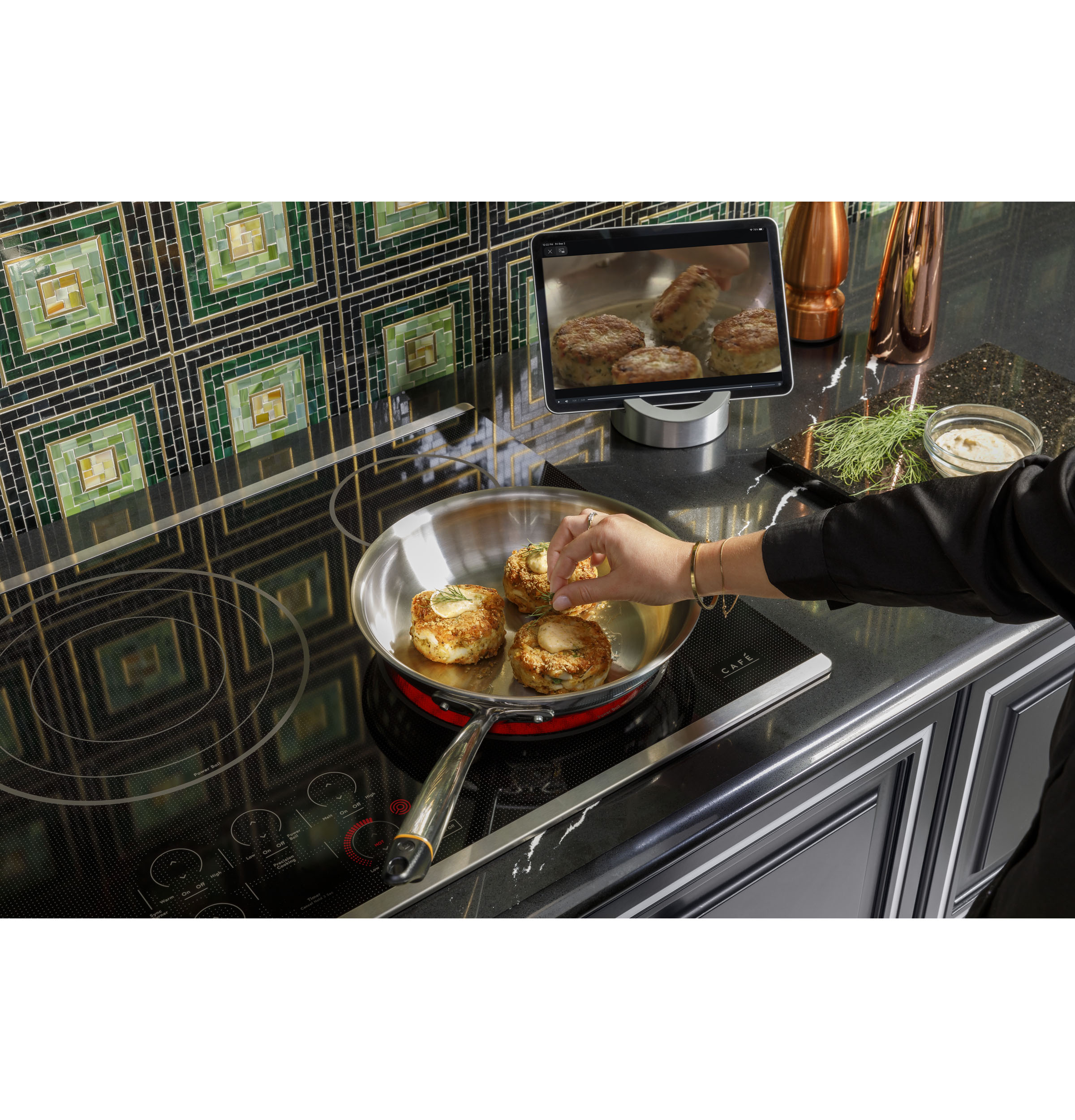 Follow along a video-guided recipe and your burners will automatically adjust time and temperature using a smart pan. Experience the joy of a perfectly cooked meal, from scallops to scrambles. Pan sold separately.